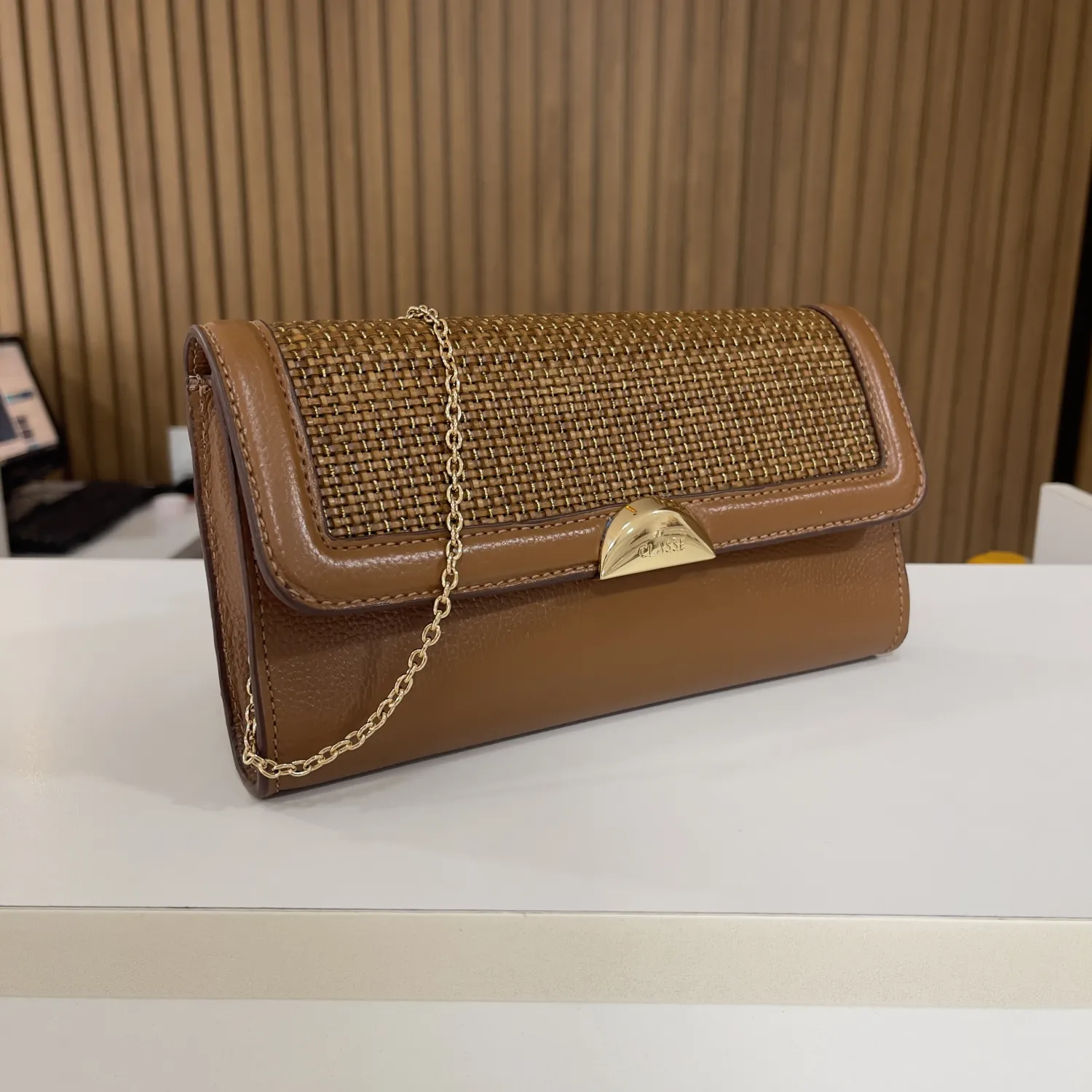 Internamente, possui espaçamento apenas para o essencial; ela conta com um pequeno bolso interno para maquiagens menores ou itens pessoais. Na parte frontal, a assinatura da marca em metal dourado é uma identidade das bolsas da Classe.