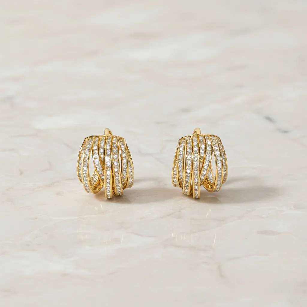 Brinco sofisticado composto por múltiplas argolas drapeadas em banho dourado, cada uma delicadamente microcravejada com zircônias cristais que garantem brilho intenso e refinado. O design volumoso, porém leve, cria um movimento elegante que destaca o rosto com modernidade e glamour. Ideal para compor produções clássicas ou acrescentar um toque de luxo ao look do dia a dia.