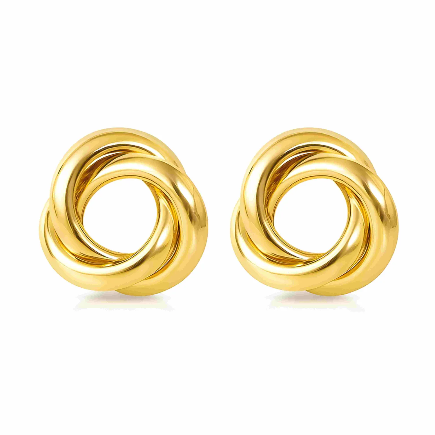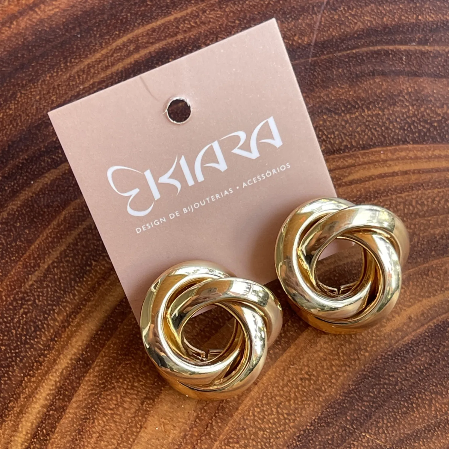 Brincos em formato de nó entrelaçado, feitos em metal com banho dourado de excelente durabilidade. A forma circular garante equilíbrio visual e estilo atemporal.