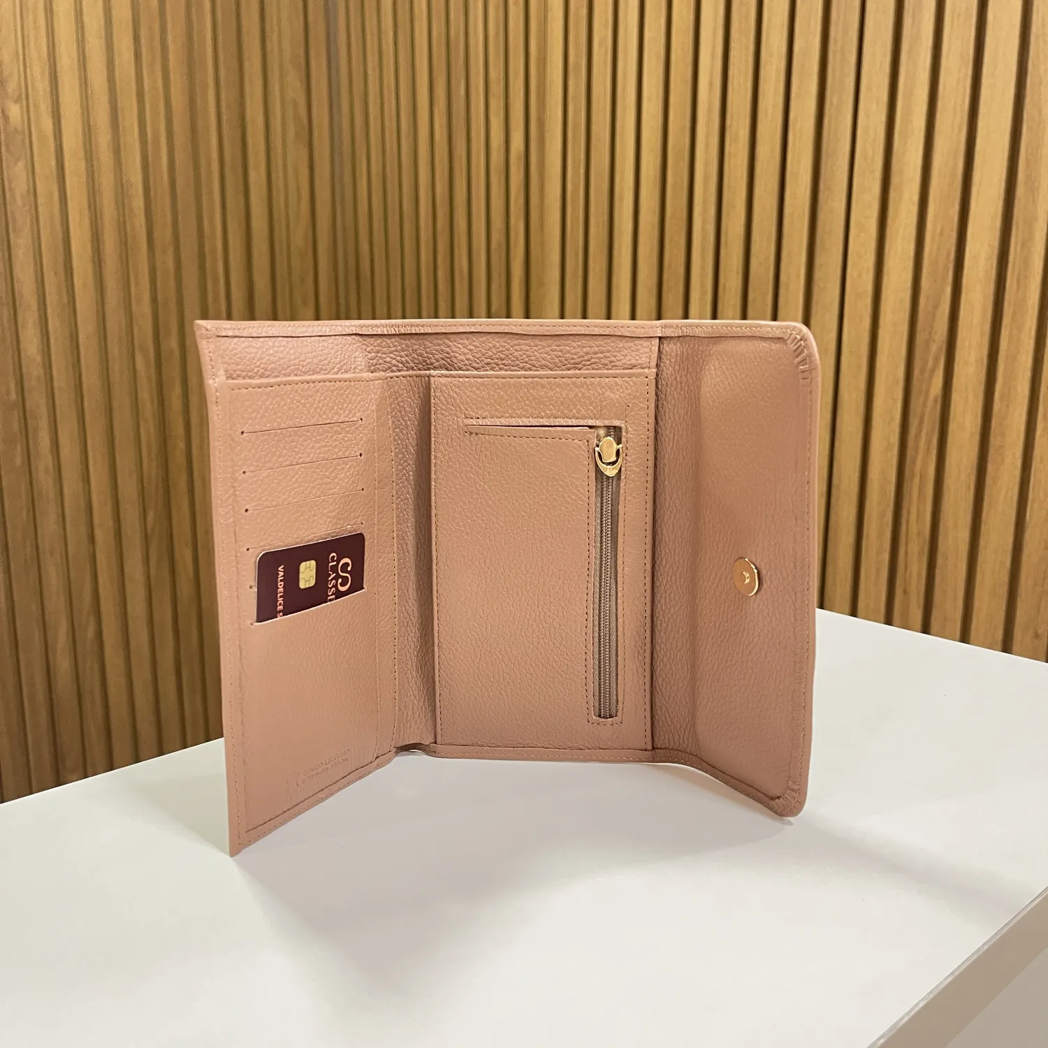 Elegante, atemporal e extremamente funcional, a Carteira Feminina em Couro Mocaccino é confeccionada em couro de alta qualidade, com toque macio e acabamento refinado. Seu design clean e sofisticado valoriza a estética minimalista, enquanto o tom rosé confere delicadeza e modernidade à peça.