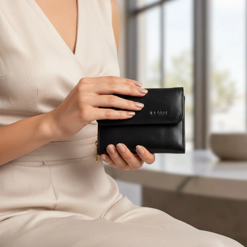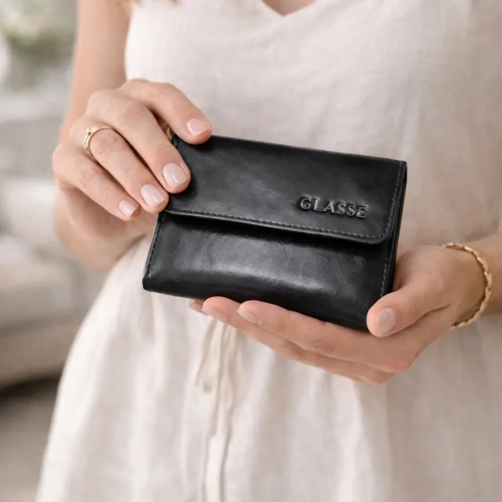 A carteira feminina CLASSE em couro preto combina design atemporal, acabamento refinado e funcionalidade na medida certa. Confeccionada em couro legítimo, possui textura macia, estrutura elegante e fechamento seguro, ideal para acompanhar a rotina com discrição e classe.