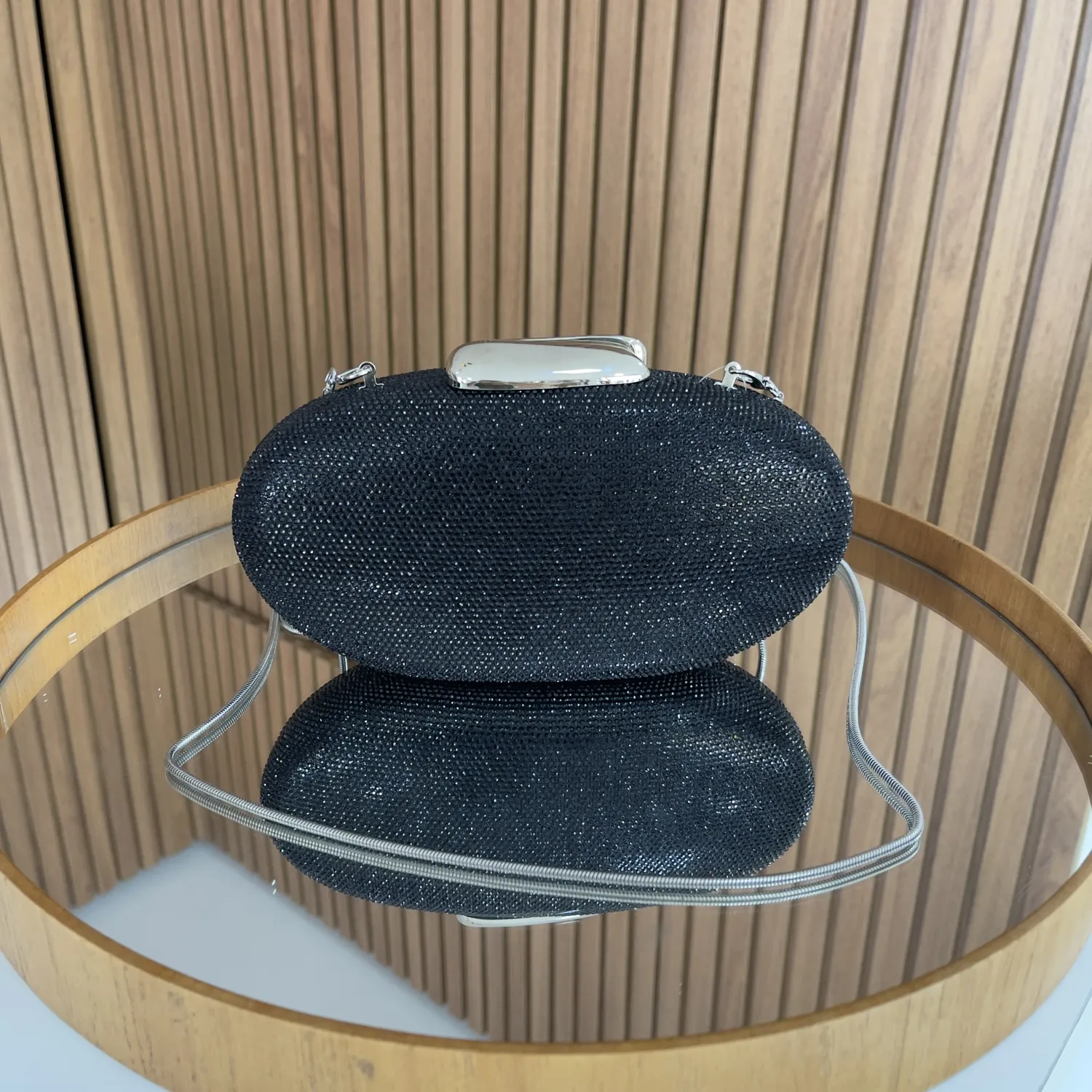 Sofisticada e versátil, esta clutch oval preta com acabamento brilhante é a escolha ideal para compor produções noturnas com elegância e discrição. Seu design clássico valoriza o visual e combina perfeitamente com eventos, festas e ocasiões especiais.