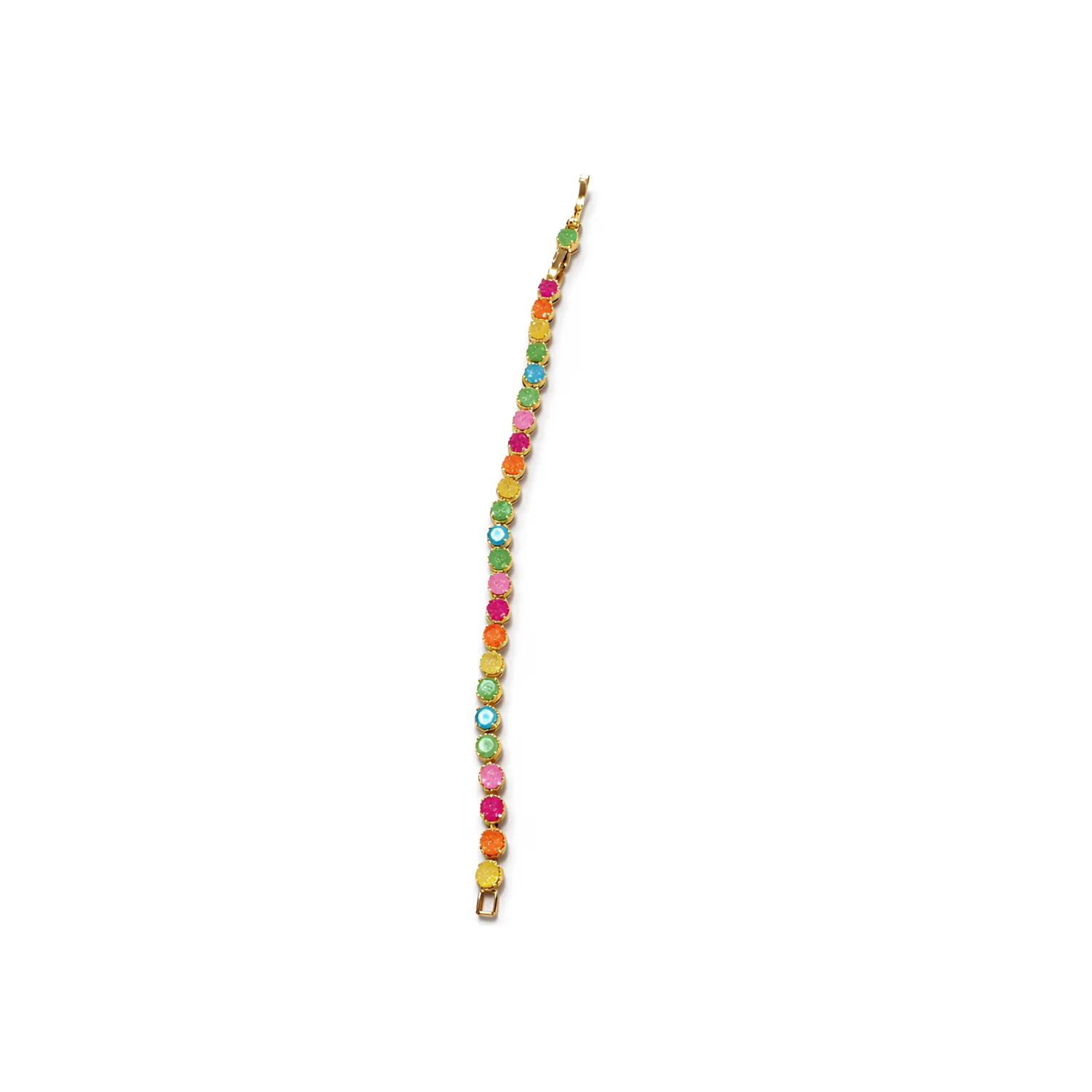 A pulseira perfeita para quem ama cor, brilho e sofisticação. Desenvolvida em semi joia com banho em ouro 10 milésimos, essa peça é composta por zircônias coloridas cravejadas que criam um visual alegre, elegante e atemporal.